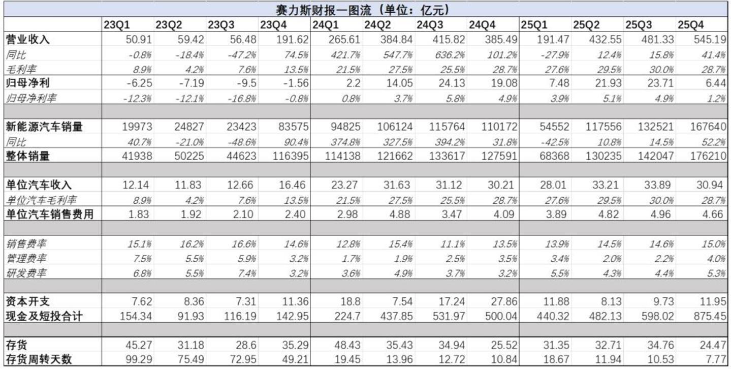 3月30日晚,赛力斯发布2025年财报,全年实现营业收入约1650.5亿元,同比增长13.69%,第四季度营收录得545亿元;归属于上市公司股东的净利润约59.6亿元,微增0.18%,净利润明显低于分析师预期,第四季度归母净利润仅为6.4亿元,归母净利率仅为1.2%,财报一图流如图所示(单位亿元,下文所有数据来源均来自企业财报)。