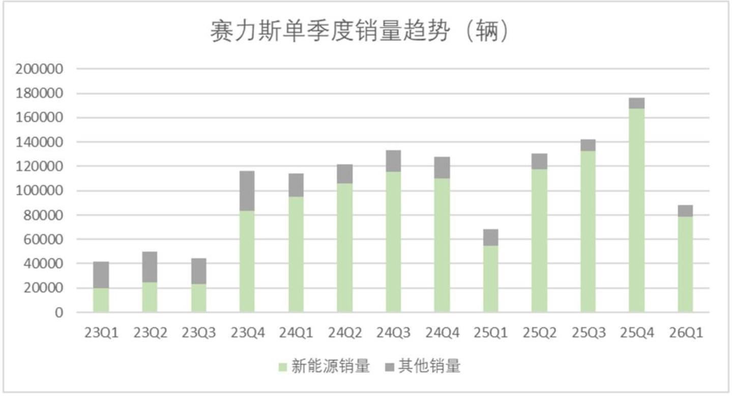 分季度来看,2025年第四季度赛力斯新能源汽车交付达到了16.8万辆,创单季度新高。今年一季度,受到补贴退坡和部分地区以旧换新政策变动的冲击下,赛力斯保持了相对强势,一季度新能源车累计销量7.85万台,高基数下同比增长了43.9%。