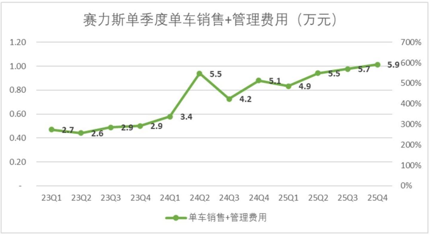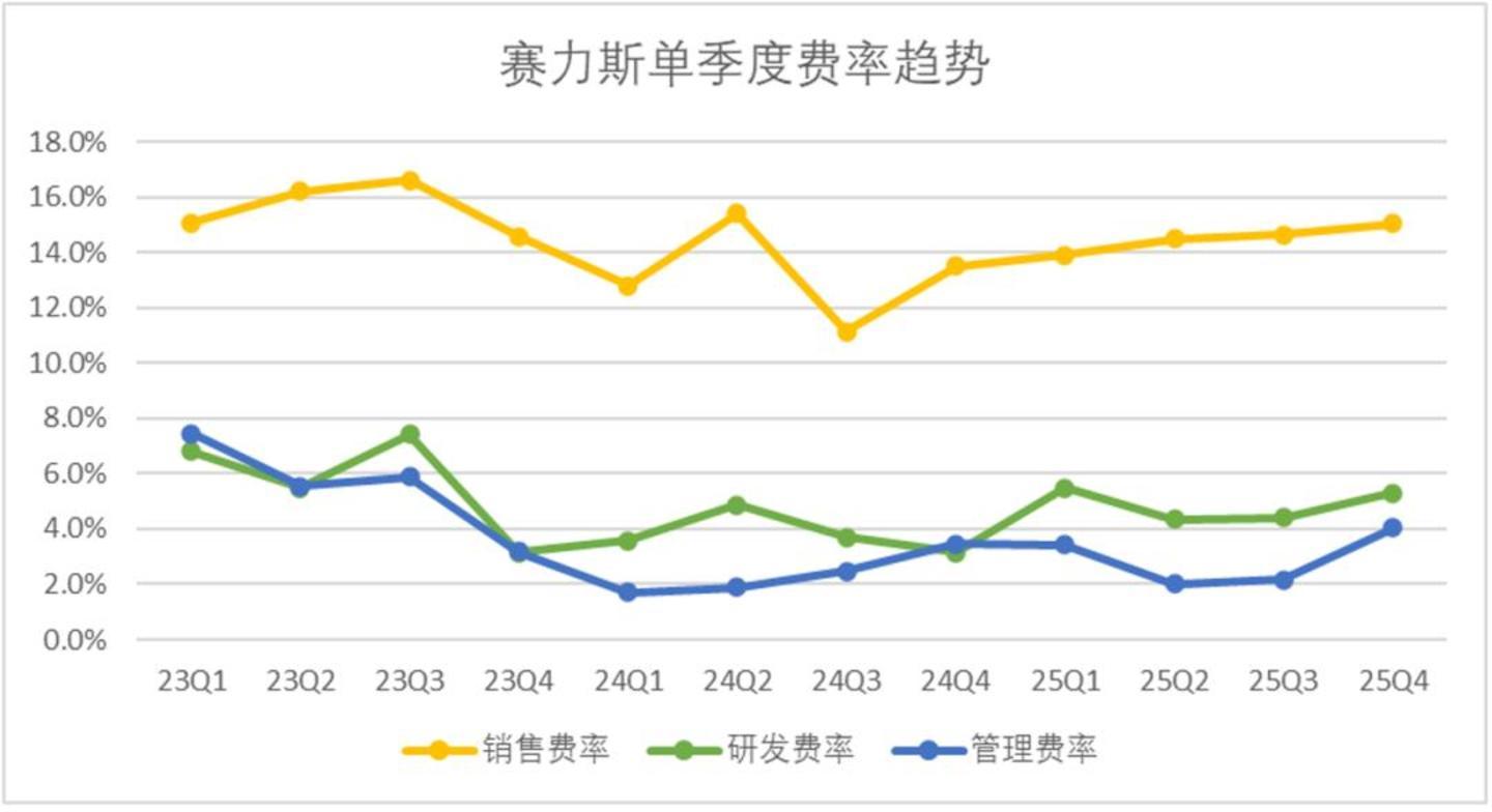 2025年第四季度,赛力斯销售费用、管理费用、研发费用分别录得82亿、22亿及23亿元,三项费率分别达到了15%、4%、5.3%。同比增长了150bp、60bp及220bp。直接影响了4.2%的利润水平。