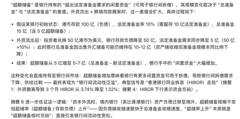 此时我们应该摒弃教科书的刻板印象,找到HIBOR下降的真正原因:并非因为流动性改善,而是存款搬家。此部分AI阐释的比我讲的清楚,贴在下面。
