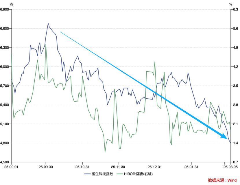 2025年Q4之后恒生指数表现整体上比较疲累,与之所对应的乃是HIBOR的同步下行(香港银行间短期资金借贷的利率),许多人对此会比较迷茫,利率下行意味着流动性宽松,理论上应该有利于股市,但为何股市不升反降呢?