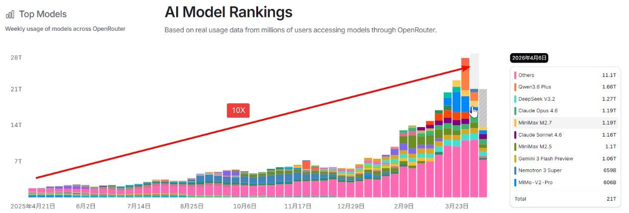 首先是AI产业整体仍维持高速增长。2026年以来,受益于OpenClaw等AI应用兴起,Token调用量持续高增。字节跳动3月Token调用量已达120万亿(月均3600T),三个月实现翻倍。平台内累计Token用量超1万亿的企业客户从去年底100家增至140家。该趋势与OpenRouter周度数据同比十倍增长相互印证,共同反映全球AI产业的高速扩张态势。