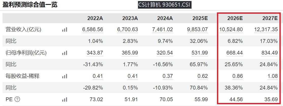 其次估值位于历史中枢附近,成长确定性较强:当前PE-TTM为59.46x,近5年分位值为68.84%,近10年分位值低为56%;PS-TTM为3.05x,近5年分位值为49.15%,近10年分位值为27.71%,整体估值处于历史中枢附近。另外据Wind一致预期,CS计算机未来两年营收和利润两方面均有不错的成长性。2026~2027年两年营收复合增速约12%,归母净利润复合增速有望超过25%。