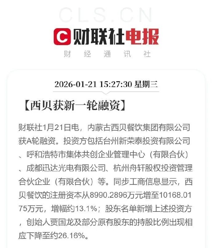 融资完成后,注册资本从8990.29万元增至近1.02亿元,增幅约13%。贾国龙及部分原有股东的持股比例相应稀释,降至约26.16%。