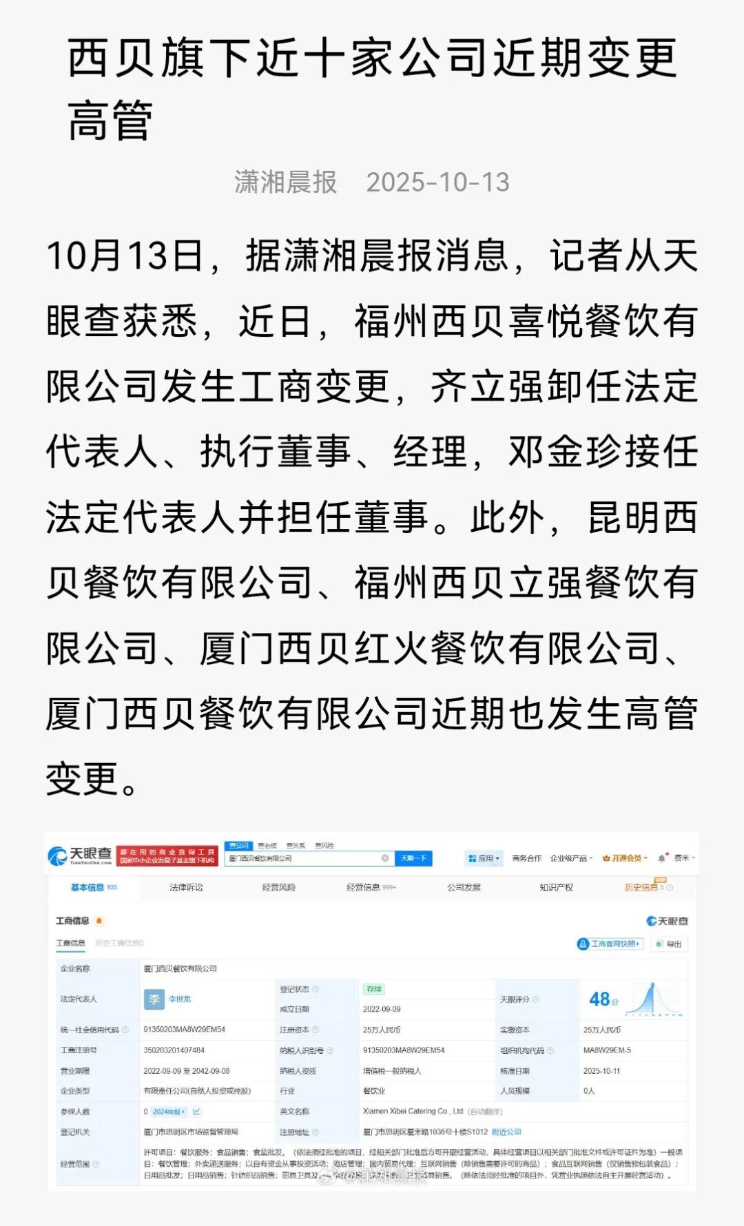风波之后,西贝旗下近十家公司密集变更高管。去年9月,贵州西贝万家、广州西贝、珠海西贝等公司调整负责人;10月,福州西贝喜悦、昆明西贝、福州西贝立强、厦门西贝红火、厦门西贝等公司相继换帅。