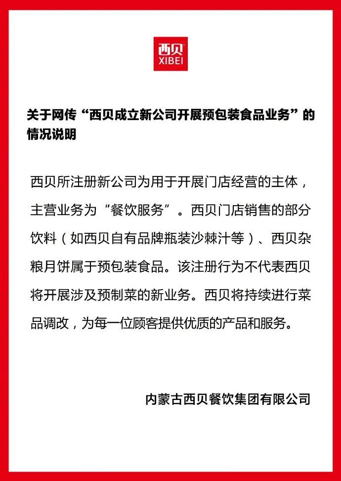 对此,西贝很快就作出了回应,表示:这家新公司是用于开展门店经营的主体,主营业务仍是“餐饮服务”;门店销售的部分饮料(如西贝自有品牌瓶装沙棘汁)、西贝杂粮月饼,确属预包装食品,但“该注册行为不代表西贝将开展涉及预制菜的新业务”。