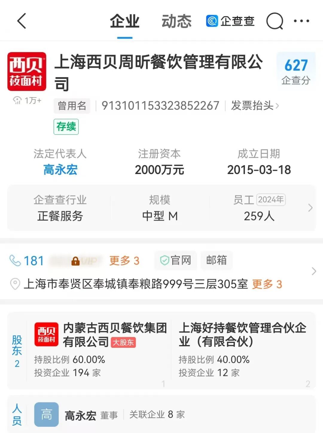 早在2015年,双方就共同出资成立了上海西贝周昕餐饮管理有限公司。其中,西贝集团持股60%,上海好持餐饮管理合伙企业(有限合伙)持股40%。