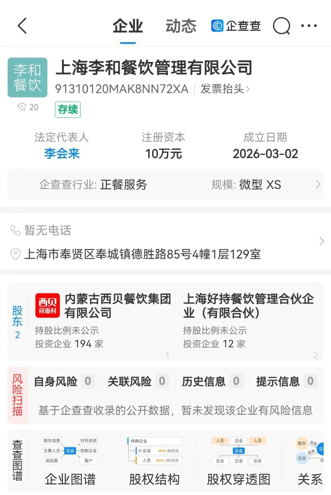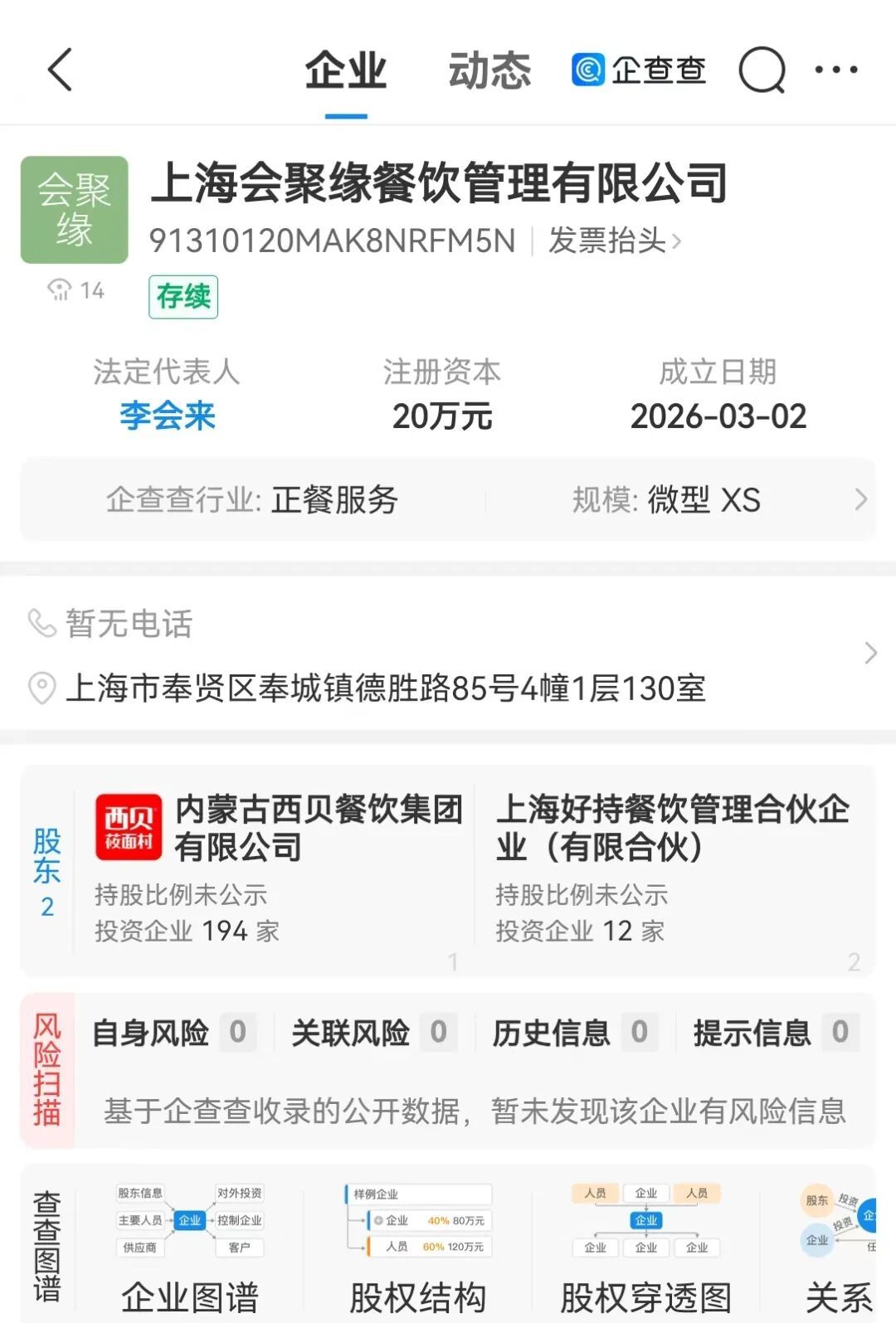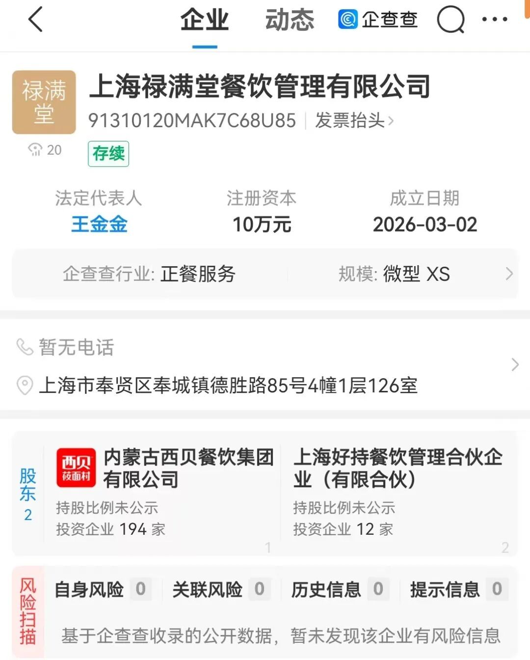 近日,上海李和餐饮管理有限公司、上海禄满堂餐饮管理有限公司、上海会聚缘餐饮管理有限公司成立,经营范围均含餐饮管理、企业管理等。企查查工商信息显示,三家公司均由内蒙古西贝餐饮集团与上海好持餐饮管理合伙企业(有限合伙)共同持股。