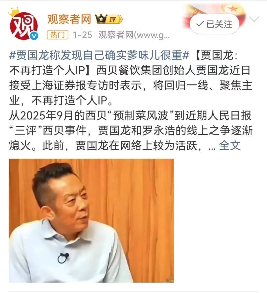 贾国龙时隔不久后发声,表示将回归一线,不再打造个人IP,关闭亏损门店以优化现金流。