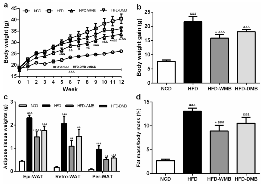 体重控制:与只吃高脂饲料的小鼠相比,全绿豆组显著抑制了体重的增长。